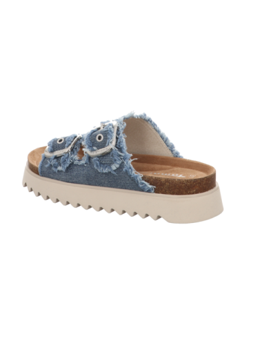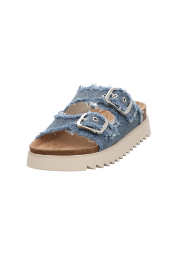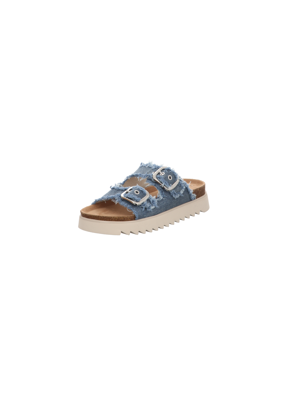 Pantoffel in jeansblauen Textil mit Plateausohle.