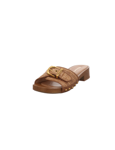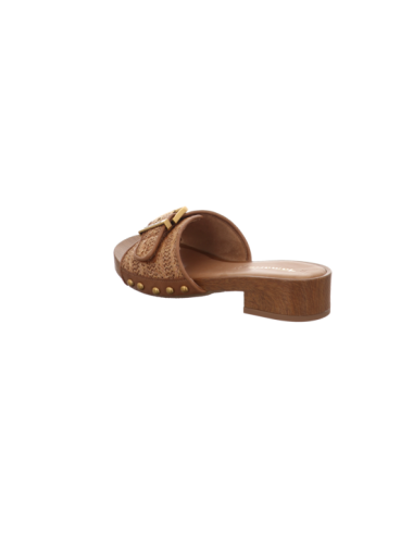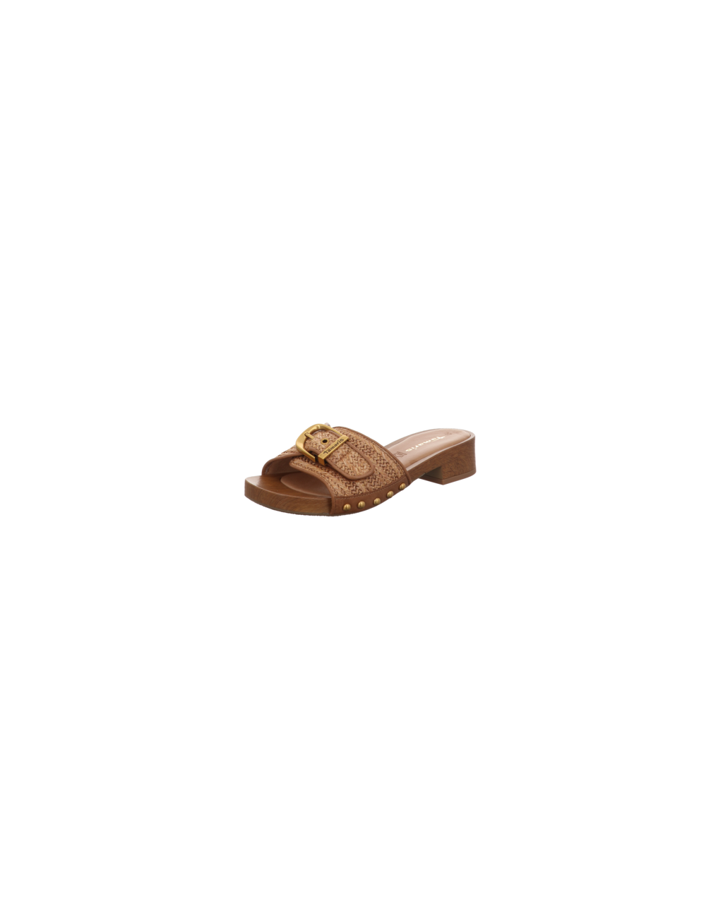 Pantoffel in cognacbraunen Textil mit Gummisohle.