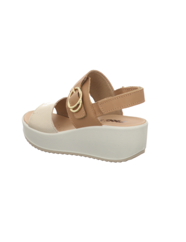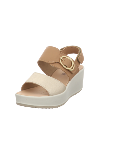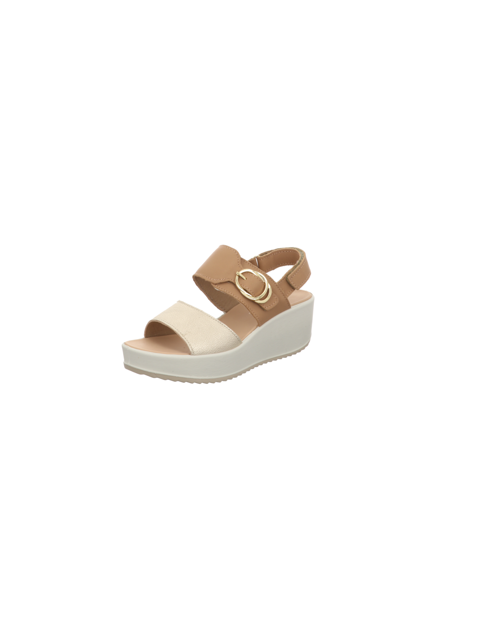 Plateausandale in beige-goldenen Glattleder mit einer Absatzhöhe von ca. 5 cm und Gummisohle.