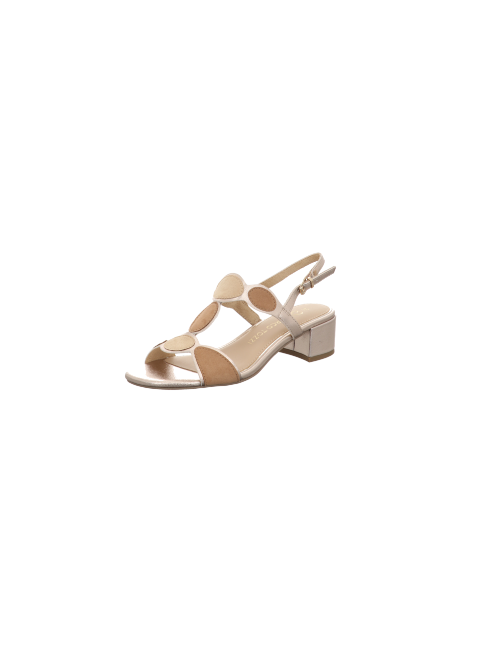 Sandale in gold kombinierter Glattlederoptik mit einer Absatzhöhe von ca. 4,5 cm und Pu - Sohle.