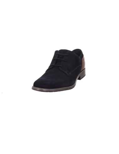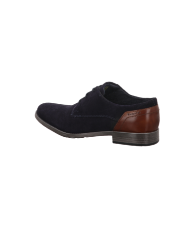 Schnürer in blauem Textil mit dunkelbraunem Leder bei der Ferse und einer PU Sohle