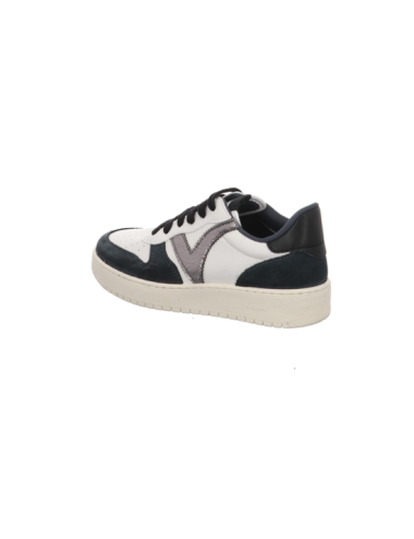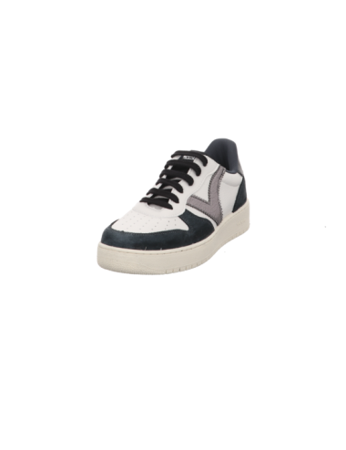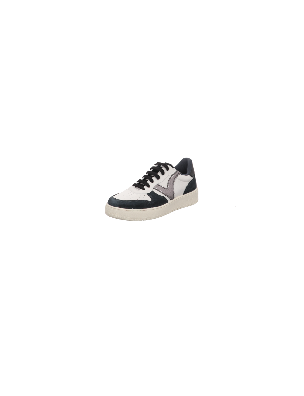 Snkeaker in weißer Glattlederoptik mit blauen Raulederdetails und einer Gummisohle