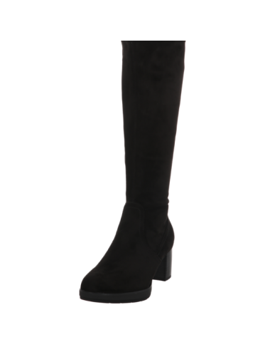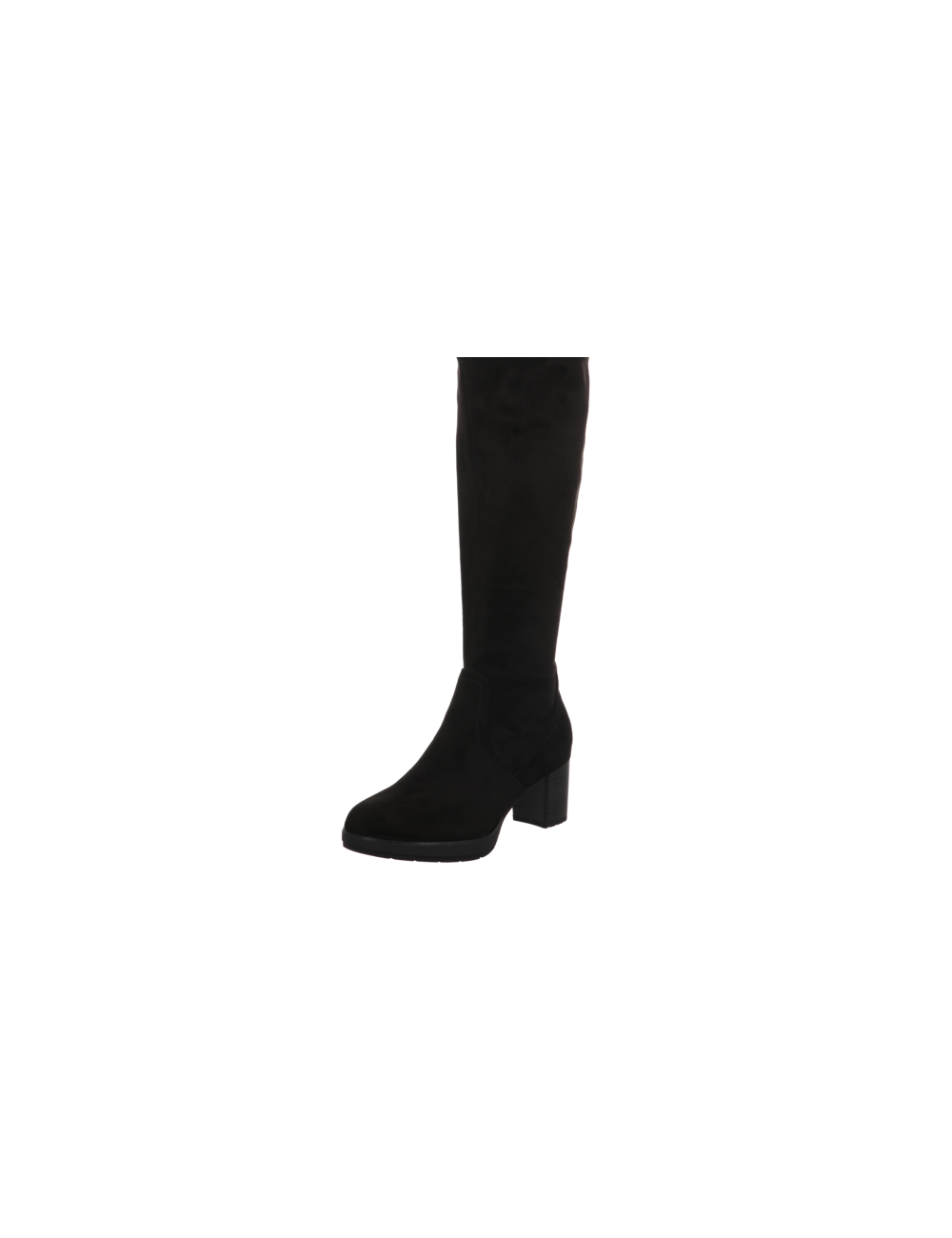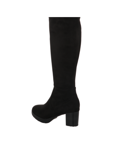 Stiefel in schwazer Rauhlederoptik mit einer Absatzhöhe von ca. 6 cm und Gummisohle.