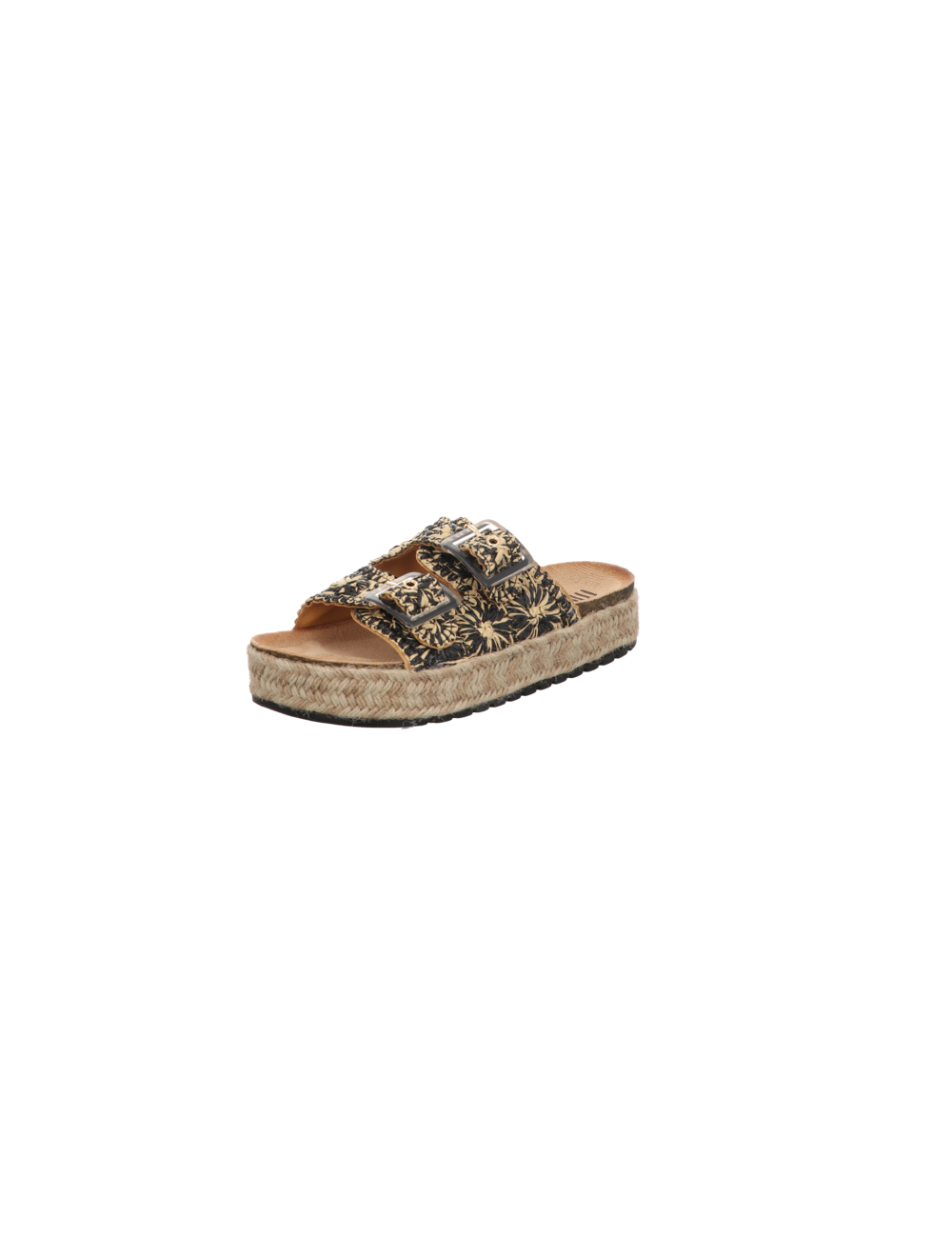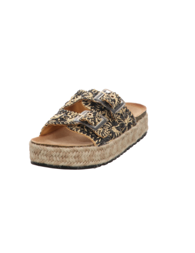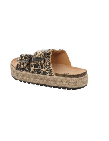 Tieffußbettpantoffel in schwarz kombinierten Textil mit Plateausohle.
