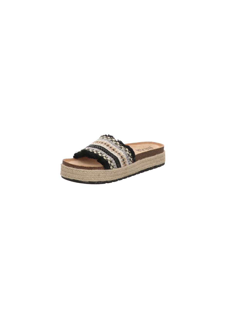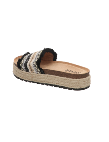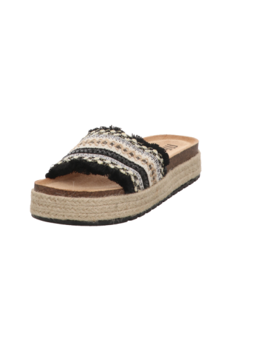 Tieffußbettpantoffel in schwarz kombinierten Textil mit Plateausohle.
