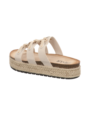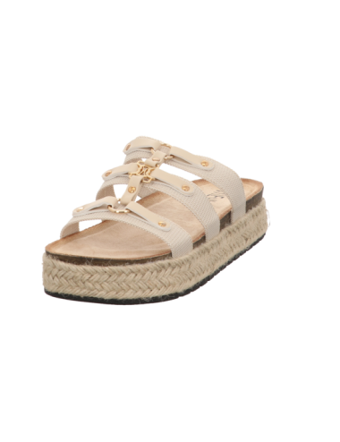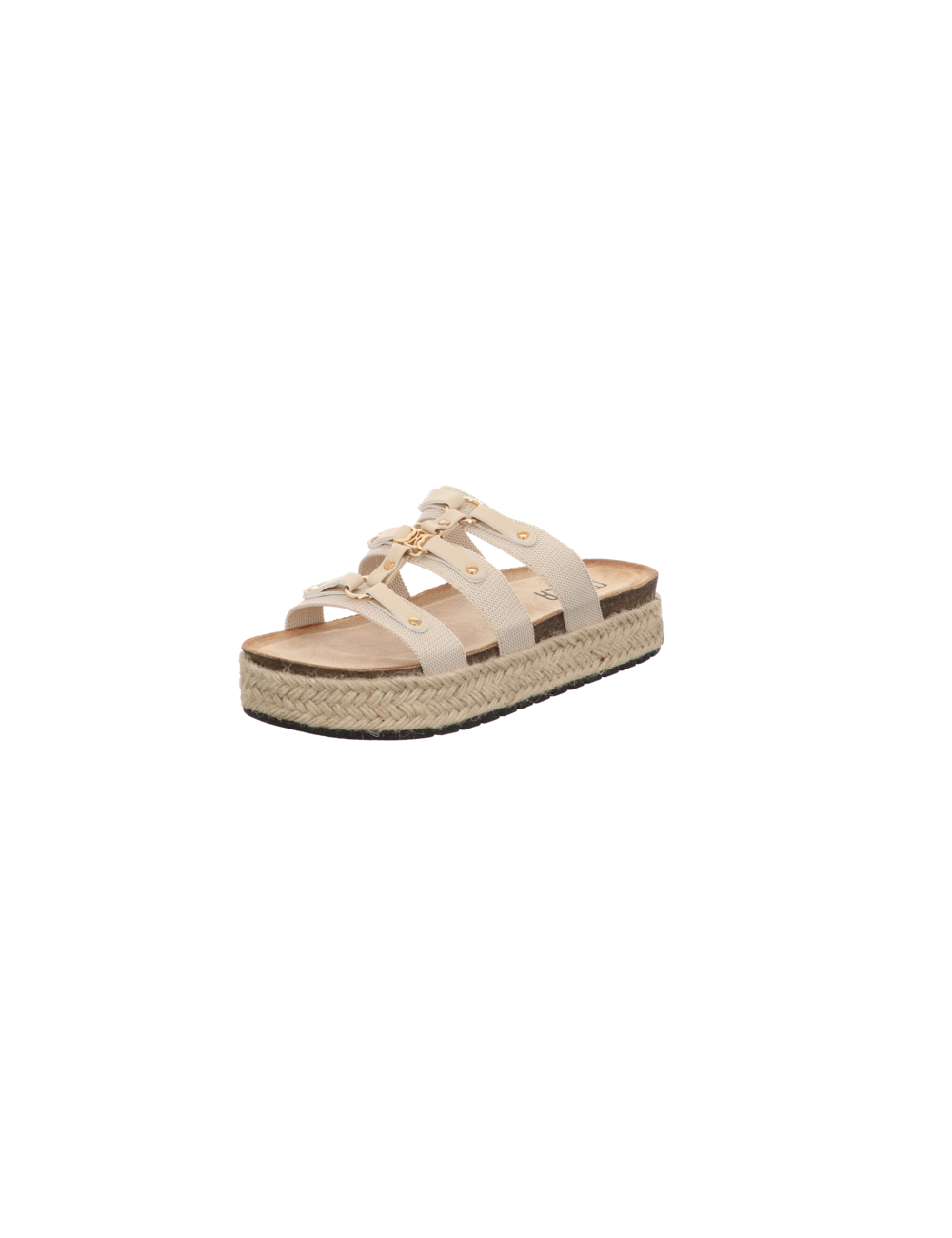 Tieffußbettpantoffel in beigen Textil mit Plateausohle.