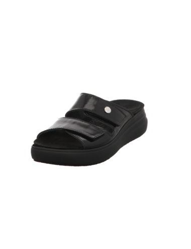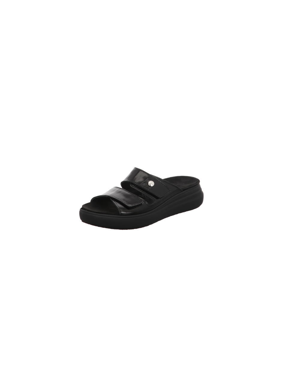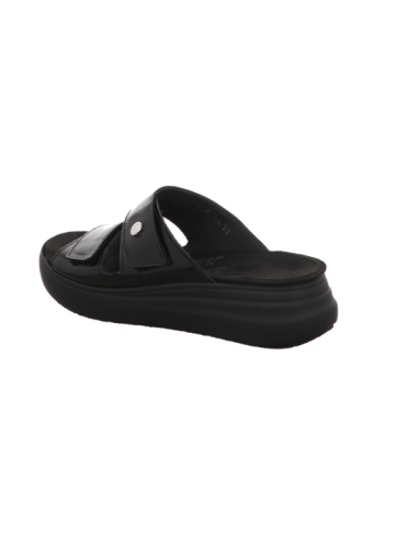 Pantoffel in schwarzen Lackleder mit Wechselfußbett und Gummisohle.