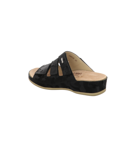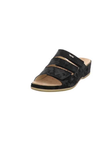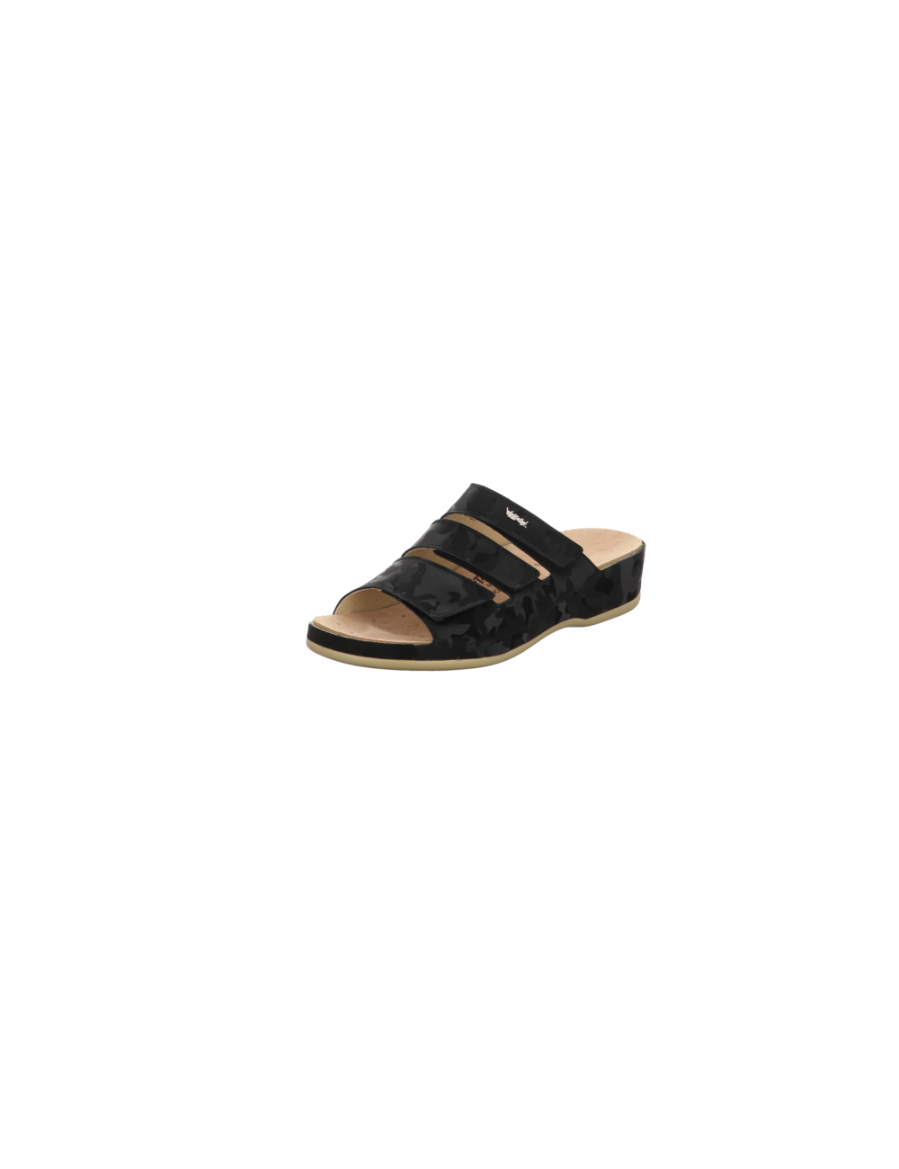 Schicker Pantoffel aus schwarzen Rauhleder und mit drei Klettverschlüssen auf der Vorderseite, die für einen perfekten Halt sorgen. Das einzigartige, undeformierbare Vital-Tieffußbett sorgt für eine sanfte Reflexzonenmassage und kann je nach Belieben ausgetauscht werden. Der Absatz misst eine Höhe von ca. 4,5 cm. Das Futter ist aus naturgegerbtem Kalbleder und daher frei von jeglichen Schadstoffen. PU-Sohle.