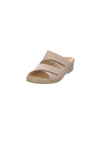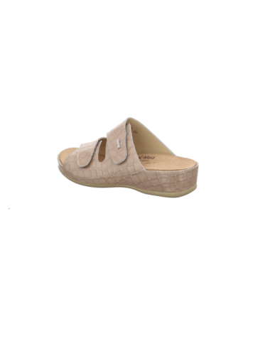 Pantolette aus beigen Lacklleder mit zwei Klettverschlüssen auf der Vorderseite, die für einen perfekten Halt sorgen. Das einzigartige, undeformierbare Vital-Tieffußbett sorgt für eine sanfte Reflexzonenmassage und kann je nach Belieben ausgetauscht werden. Der Absatz misst eine Höhe von ca. 3,5 cm. Das Futter ist aus naturgegerbtem Kalbleder und daher frei von jeglichen Schadstoffen.