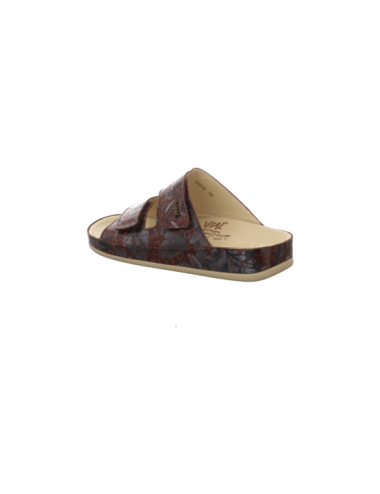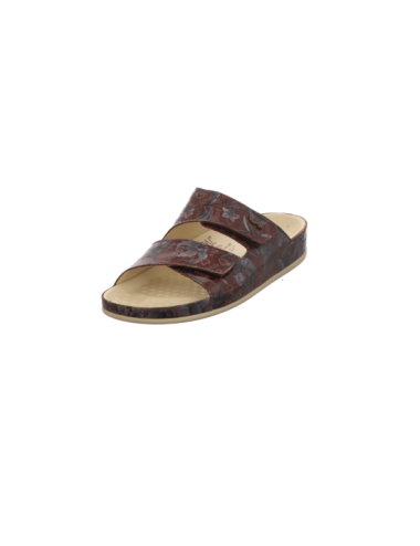 Der Klassiker unter den Gesundheitspantoffeln aus braun gemusterten Glattleder mit zwei Klettverschlüßen und dem einzigartigen undeformierbaren