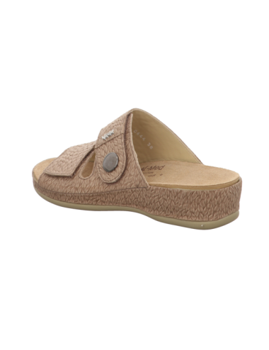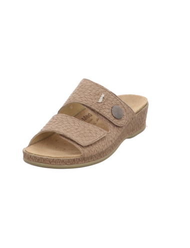 Schicke Pantolette aus kombinierten beigen Rauhleder mit zwei Klettverschlüssen auf der Vorderseite, die für einen perfekten Halt sorgen. Das einzigartige, undeformierbare Vital-Tieffußbett sorgt für eine sanfte Reflexzonenmassage und kann je nach Belieben ausgetauscht werden. Der Absatz misst eine Höhe von ca. 3,5 cm. Das Futter ist aus naturgegerbtem Kalbleder und daher frei von jeglichen Schadstoffen.